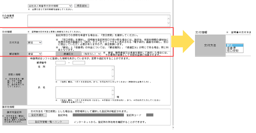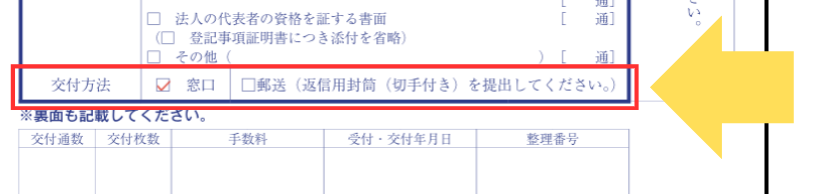 交付方法は窓口での受領もしくは郵送での受領を選べます。ご希望の方法にチェックしましょう。
