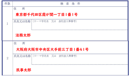 現在の氏名・住所に加え、過去の氏名・住所を検索条件としたい場合には↓のように2行にわけて記載しましょう。