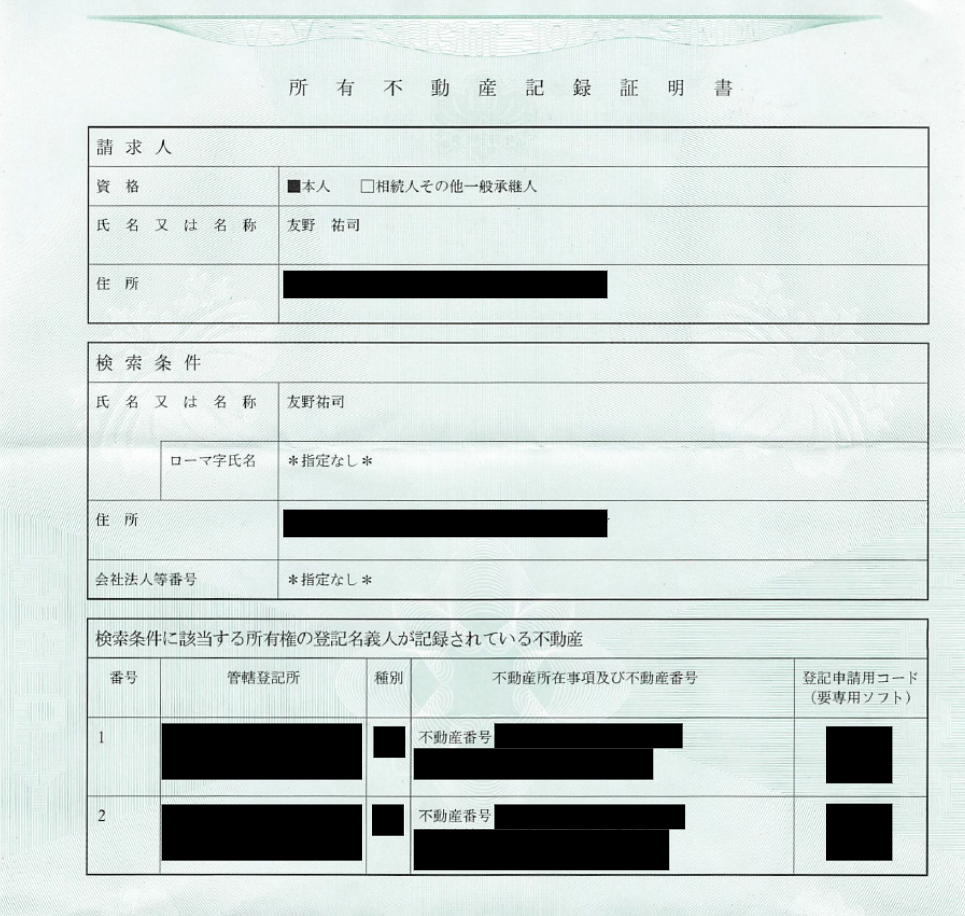 実際に届いた証明書はこちら↓不動産の所在地番や家屋番号が記載されるので所在がわからない不動産もこれで確認することができますね。
